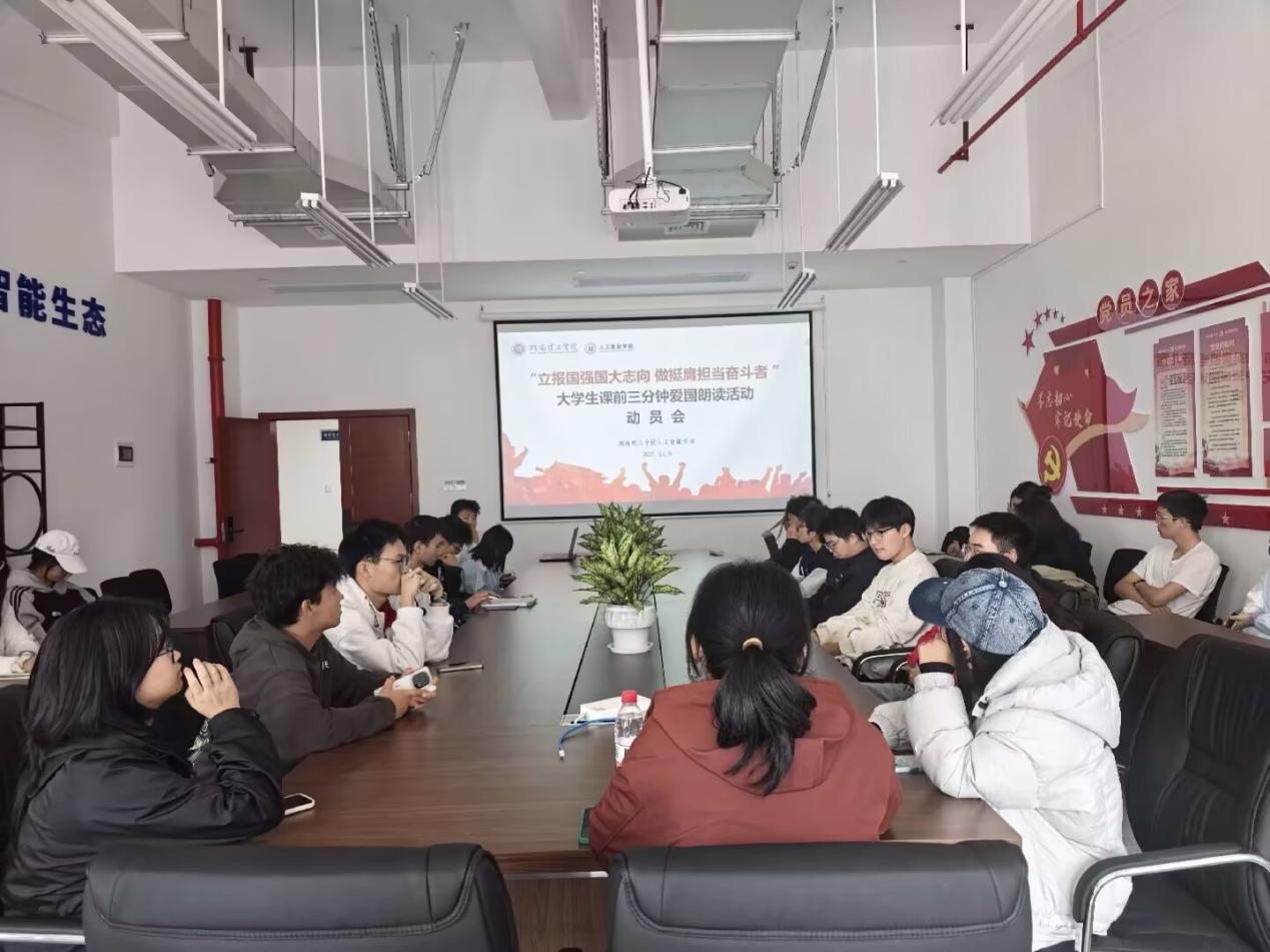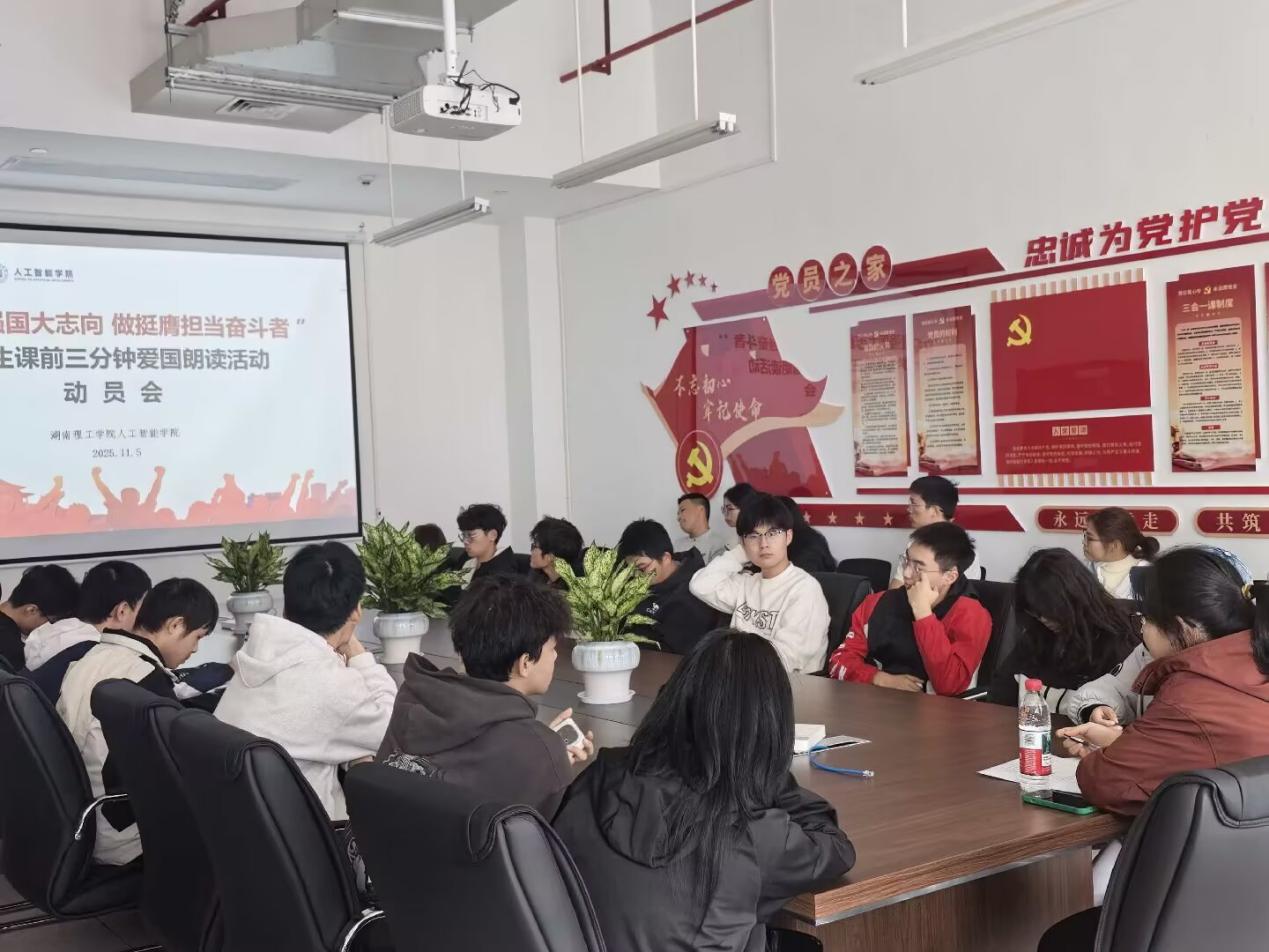11月5日中午12时,人工智能学院于17505B会议室举行“立报强国大志向,做挺膺担当奋斗者——大学生课前三分钟爱国朗读”动员大会,本次会议旨在激发大学生爱国情怀,让红色基因浸润心灵,爱国情怀扎根青年心底。院团学学生会学习纪检部、青年传媒中心干事及各班班委代表参会,本次会议由25级辅导员余滔主持。