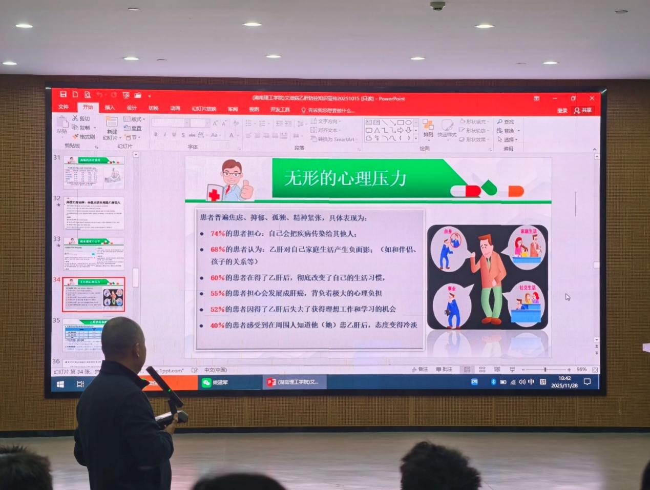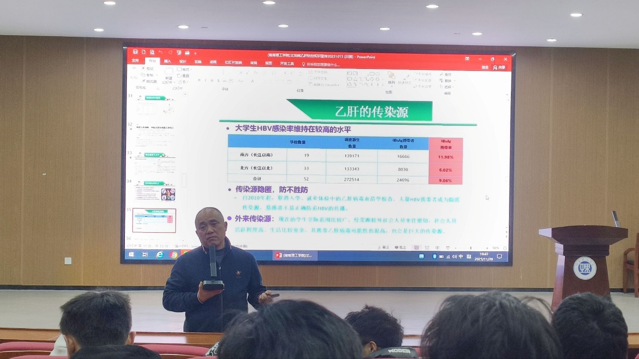 为提高学生对乙型病毒性肝炎的认知水平,普及科学防治知识,倡导健康生活方式,11月28日,人工智能学院于17118会议室成功举办乙肝健康教育专题讲座。讲座由校医院姚建军主讲,2025级全体新生参加。