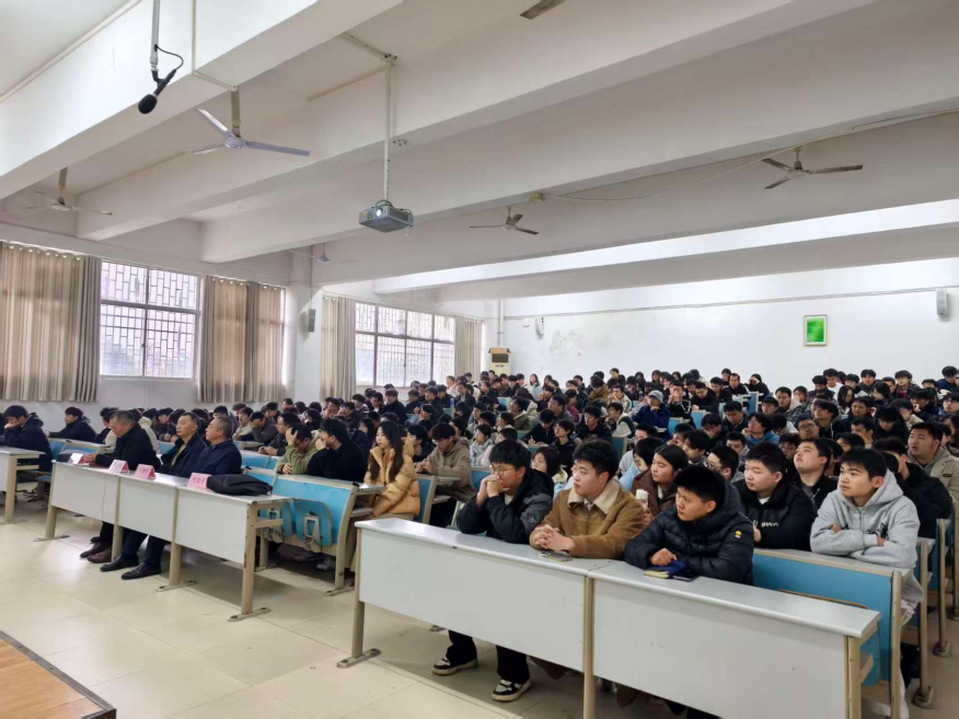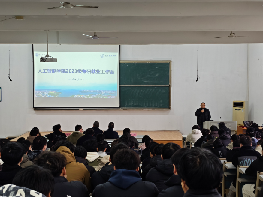 为引导2023级学生科学规划未来,扎实做好升学与就业准备,2025年12月24日下午14时30分,人工智能学院在7T2阶梯教室召开2023级考研就业工作会。学院院长吴健辉、党委书记贺波彬、副院长周峰出席,2023级全体学生及辅导员共同参会。会议由学院党委副书记付亚子主持。